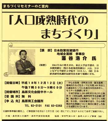 | 20061212まちづくり講演会 講演資料データ (パワーポント形式) (HTML形式) 環境によっては、体裁が崩れて表示される場合がります *パワーポントがない方は 下記ページの無料ソフト「OpenOffice.org」をダウンロードして 自分のパソコンにセットすると、見ることができます。 (自己責任でお願いします) 窓の杜 - OpenOffice.org |