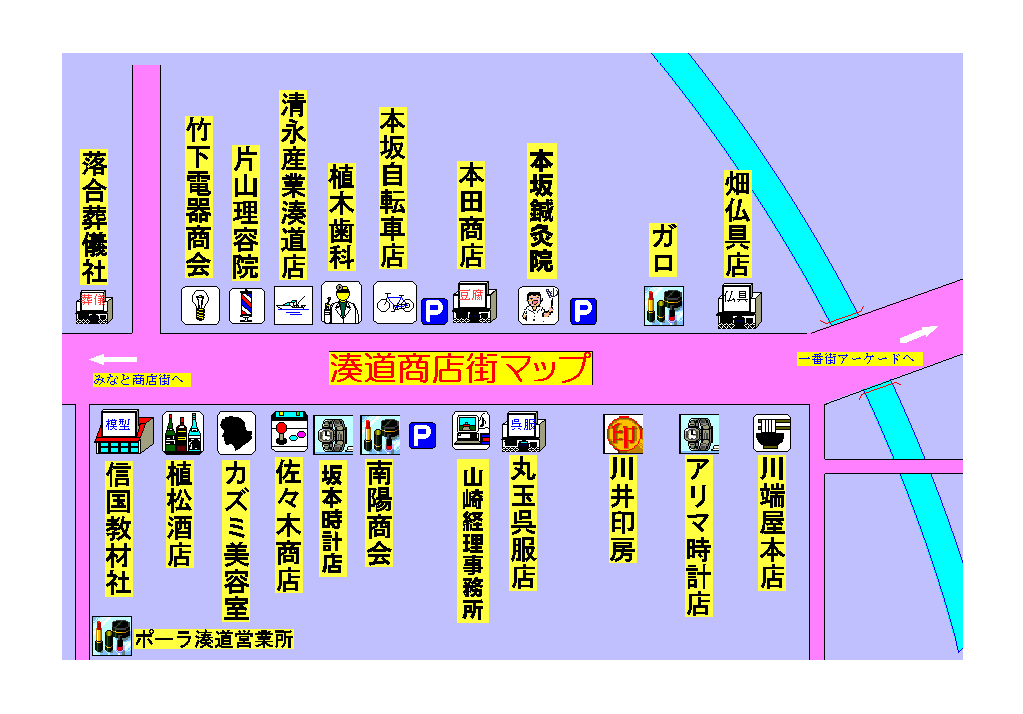 湊道商店街のマップです。お探しのお店のマークを