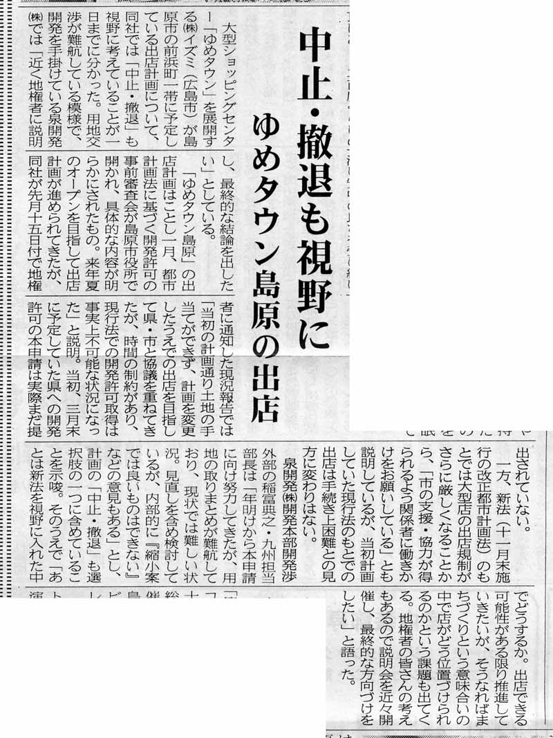 | 「ゆめタウン島原計画断念か?」 泉開発(株)が今月中旬に、地権者宛へ送付した文書によると 「時間上の制約があり現行法での開発許可取得は事実上不可能になりました」 と 今年秋のいわゆる『まちづくり3法』全面施行前で、 開発許可が認可されない状況であることを認めている。 さらに 「今後の見通しが不確実のまま、計画の推進を続けることは、 地権者の皆様にさらなるご迷惑をお掛けすることになり、 当社の本意ではありません。現在、行政への協力を働きかけていますが、 その回答次第では、まことに残念ながら5月末日を持って計画を中止し、 撤廃することも視野に入れ対処いたしたく考えております。」 と、 新法下での行政への協力を呼びかけているものの、 期待通りの回答が得られない場合は出店を中止する考えを示している。 同社は、行政側からの回答を待たずに 撤退する内容の文書を送付していることから、 事実上の出店計画断念を決めていると見られる。 ソース http://blog.ynconsul.com/?day=20070529 |